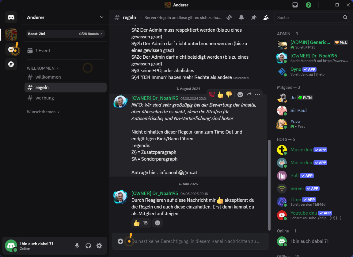 | Du hast Zugriff auf diese Kanäle In willkommen wirst du begrüßt, das ist aber nicht so wichtig In regeln stehen die Server-Regeln drinn |
