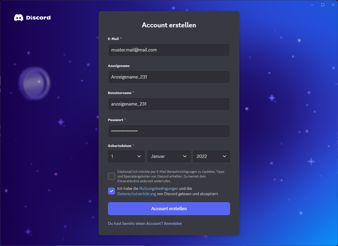 | Hier Erstellst du deinen Account Du kannst alles im Nachhinein ändern Wenn du von Discord nicht permament belästigt werden willst dann akzeptiere nur die Nutzungsbedingungen und Datenschutzerklärung Lasse das obere Kästchen einfach frei |